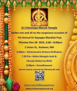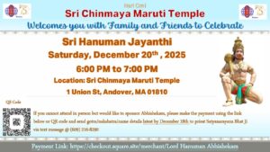 Pujya Guruji Swami Tejomayananda presided over the idol installation ceremony of Lord Maruti (Hanuman) and his talks on Hanumanji were the highlights of the event. The 12,000 sq ft brick building is situated on a 2.5-acre lot with a beautiful wooded backyard that gently slides down to the flowing Shawsheen River.