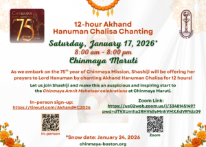 The Mission has continued mushrooming across the universe and stands today with over 400 centers worldwide.A MILESTONE Friday, June 13, 2003, marked a milestone in Chinmaya Mission Boston history with the inauguration of its new centre, “Sri Chinmaya Maruti Temple“.