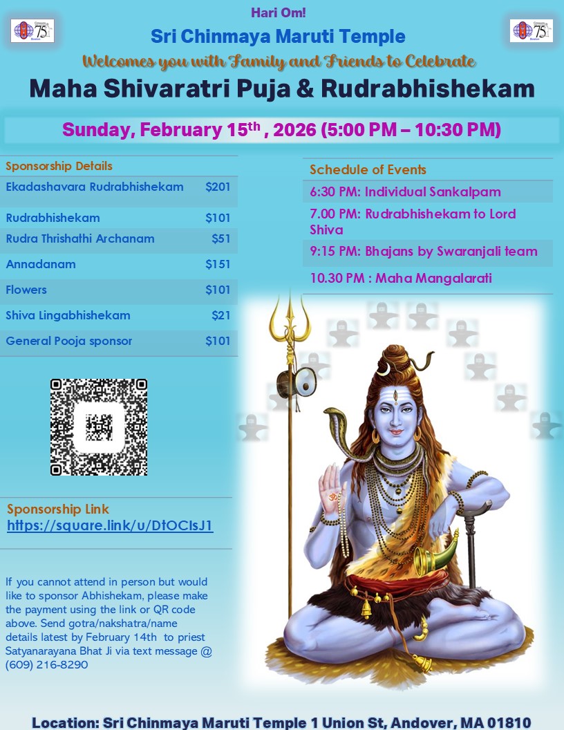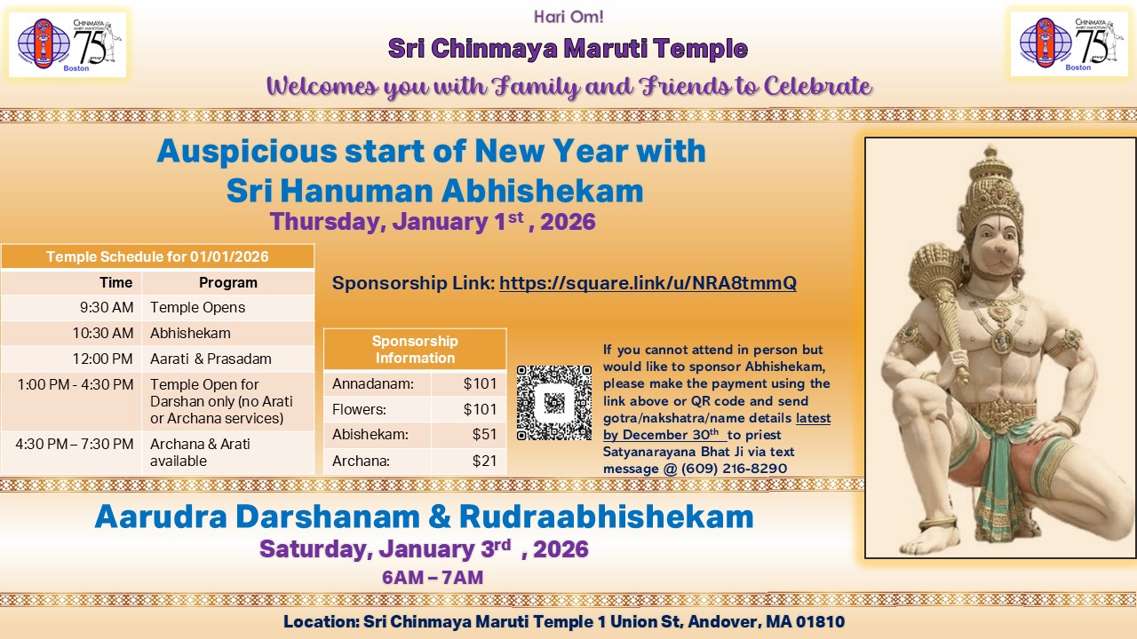 Pujya Guruji Swami Tejomayananda presided over the idol installation ceremony of Lord Maruti (Hanuman) and his talks on Hanumanji were the highlights of the event. The 12,000 sq ft brick building is situated on a 2.5-acre lot with a beautiful wooded backyard that gently slides down to the flowing Shawsheen River.
